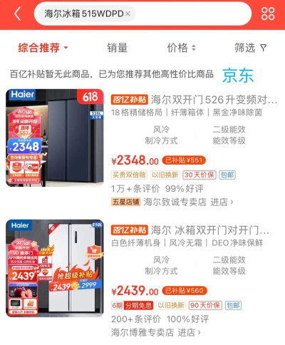 在京東,海爾有一款冰箱參加百億補貼,型號爲:BCD-515WLHSSEDS9,我用這款去淘寶百億補貼界面搜索,同時咨詢人工客服,得到的結論是,淘寶目前海爾冰箱515升參加百億補貼的型號爲BCD-515WDPD,我再用海爾冰箱515升或者BCD-515WDPD回到京東百億補貼搜索,得出的結論是,百億補貼暫無此商品,同時爲我推薦了其他商品。