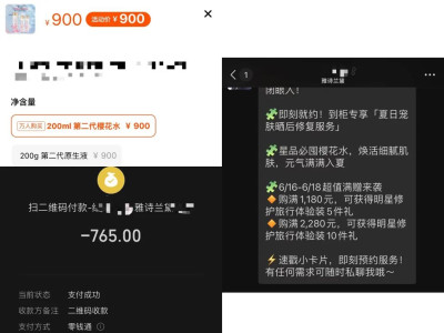 我买了一款雅詩蘭黛的“櫻花水”200ml正裝,和雅詩蘭黛天貓旗艦店推出的618活動優惠一樣,都可以送100ml的2瓶,網上活動價與线下售價相同,都是900元。但是线下專櫃這邊還可以通過積分抵現,一下子減免了135元,又讓我加企業微信,還給我多送了幾個小樣,非常劃算。