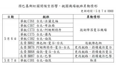 5月6日CI61桃園-法蘭克福、CI73桃園-阿姆斯特丹等航班技術轉降曼谷,更換組員及加油後返回桃園重新整備,將依新規劃航路避開受影響的區域續往目的地;5月6日CI67桃園-布拉格、CI75桃園-羅馬航班取消;5月6日CI82倫敦-桃園技術轉降布拉格,更換組員及加油後返回桃園。5月7日CI81桃園-倫敦航班取消。華航持續關注局勢發展,視需調整航班安排,相關航班異動,請參閱華航官網及App。感謝旅客的理解與配合。