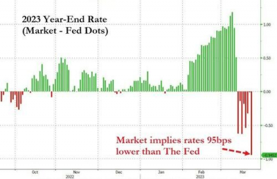 美聯儲本周公布的最新3月利率點陣圖預測曾顯示,美聯儲今年年底利率將來到5.1%,與去年12月的上一次預測持平,但如今,利率市場的定價已經比這份點陣圖預期低出了95個基點,這預示着整整多計算了近四次25個基點的降息。