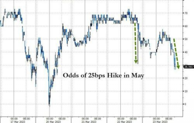 同時,美聯儲5月份下次會議加息25個基點的可能性,也已經降低至了26%。