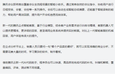 具體到產品應用上,他表示,騰訊自身的企業級應用,已經率先應用了行業大模型,針對不同應用場景提供更智能的服務,爲用戶提高工作效率: