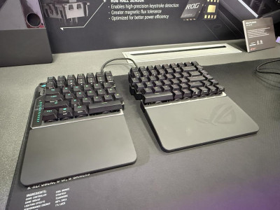 華碩此次重點聚焦在ROG,主要為周邊和顯示器等新品。其中最具話題的產品之一是ROG Falcata無線鍵盤,採用少見的左右分離式設計,除了合併使用,75%的尺寸能從中央拆分,讓玩家依照不同遊戲需求自由調整,甚至可單獨使用左側鍵盤,為滑鼠操作留出更大空間。