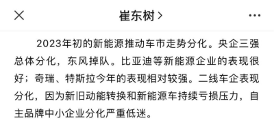 乘聯會的祕書長崔東樹則一語道破東風集團所面臨的危機:“2023年初的新能源推動車市走勢分化。央企三強總體分化,東風已經掉隊了。”