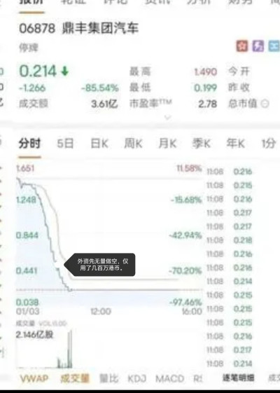 $鼎豐集團汽車(HK|06878)$ 外資先選擇適合做空的地產股,並且剛調入港股通不久,港股通持有量很少,外資开始融券,在前十幾個交易日賣空給部分港股通散戶。然後選好日子,再次融券做空至股東平倉线,而後停牌,這時候股東需要補充質押,降低平倉线,股東沒錢,外資繼續融券賣空,復牌後強制平倉,股價有量下跌20%,這時候港股通進場接盤,接走了股東被平倉股份,而外資後幾個交易日逢低從港股通手中买回股東平倉後的股份進行還券。賺取了幾倍高額的利潤。而整個過程不會超過一個月。港股通大量接盤後,港股通主力而生,繼續砸低股價收割高位被套散戶,公司股價持續下跌。由於股東質押盤平倉,嚴重影響了公司資金流,因爲這是一家民營企業。根源就是公司的防控風險機制不完善,給了對方做空的機會,從而在短短6個月使公司的發展嚴重受阻,股價接連暴跌,而整個過程中外資從中獲取的純利潤也不過幾百萬元。卻讓一家百億公司縮水至20億元市值。這就是自由市場資本的力量。成也資本,敗也資本。