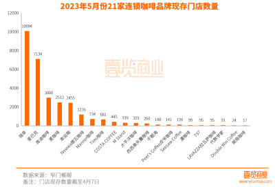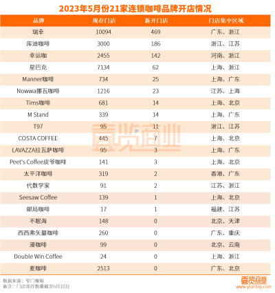 從整體开業數量看:2023年5月份,國內21家連鎖咖啡品牌一共新开門店965家,與上月相比增加392家,現存門店一共30039家。