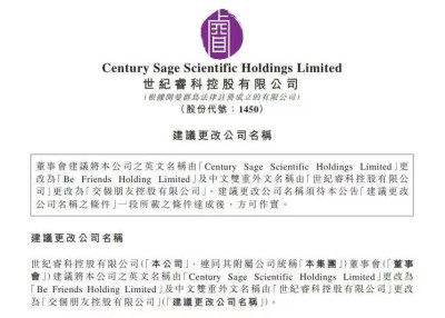 5月10日晚,港交所上市公司世紀睿科發布公告,宣布擬改名爲“交個朋友控股有限公司”,其對應英文名也將相應更改爲“Be Friends Holding Limited”。