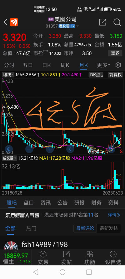 $美圖公司(HK|01357)$ 美圖發行價8.5元,上市最高23元多,一路下跌至最低0.63元,經過長達6年築底,月K线看構建成一個大的W型圖型,底部爲0.63元徑线位4.5元,目前月K线經W雙底確認後,1陽遮三陰,並刷新了前高3.33元,摸高3.47元,本周收盤3.32元創近幾年新高,可謂氣勢如虹。