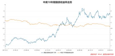 以10年期國債收益率爲例,2021年至今,美債收益率從最低0.93%漲至最高4.25%,當前在3.7%附近震蕩;而中債收益率則從最高3.29%跌至最低2.61%,當前在2.7%附近震蕩。