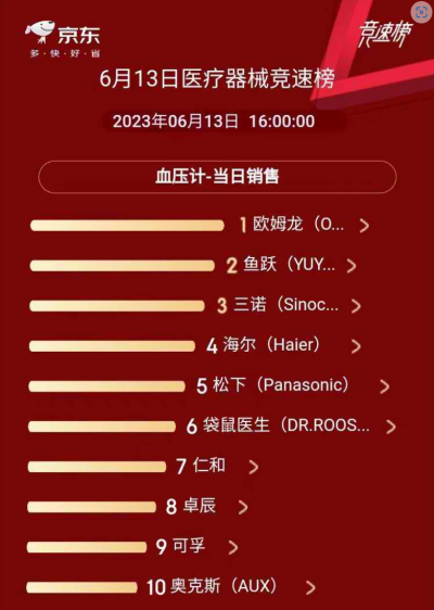 產品迭代到現在,歐姆龍從血壓管理延伸到高血壓並發症之一的房顫疾病管理領域,推出了血壓測量、房顫偵測功能二合一的房顫偵測血壓計,自帶的數據傳輸功能便於智能設備進行健康管理,實現了管理的升級。截至6月13日16點,京東健康618醫療器械競速榜顯示,以科技創新研發著稱的歐姆龍(OMRON)穩坐血壓計品牌成交第一把交椅。