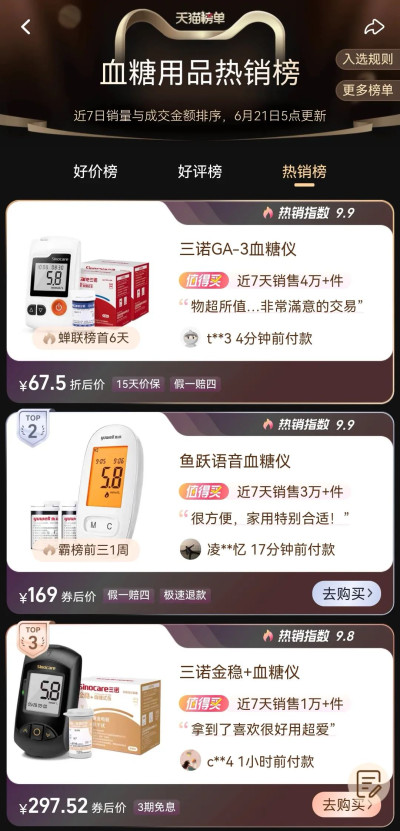 這樣的智能化水平爲三諾賦予了產品的市場競爭力。今年618期間,三諾愛看持續葡萄糖監測系統在預售階段就突破500萬銷售額,整個活動期間三諾血糖儀持續霸榜天貓熱銷榜第一。