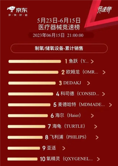 今年第11個“世界呼吸日”期間,魚躍緊抓熱點並結合京東平台造勢,大力宣傳家用制氧儀的便利與效果,多路營銷推廣下在京東5月23日至6月15日制氧/儲氧設備累計銷售榜單中榮登了銷售榜單TOP1。
