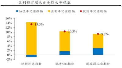 根據方正證券的統計,2010年以來納斯達克指數、標普500指數和道瓊斯工業指數年化收益率分別爲13.5%、10.3%和9.2%。分解來看,盈利穩定增長是美股長牛的根基,2010年以來納斯達克指數、標普500指數和道瓊斯工業指數盈利年化增幅分別爲14.3%、8.7%和6.3%。