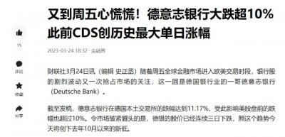 這次的倒黴鬼是德意志銀行,今天它的股價一度暴跌14%,自硅谷銀行危機爆發後,股價累計跌去了29%,近三分之一的市值灰飛煙滅。而德意志股價暴跌的原因是:投資者恐懼德意志銀行,將會發生債券信用違約。說白了,就是在歐洲暴力加息的大環境下,投資者擔心德意志銀行,會像硅谷銀行一樣,發生現金流緊缺,進而還不上到期債券的錢,導致違約。所以,投資者選擇了拋售。