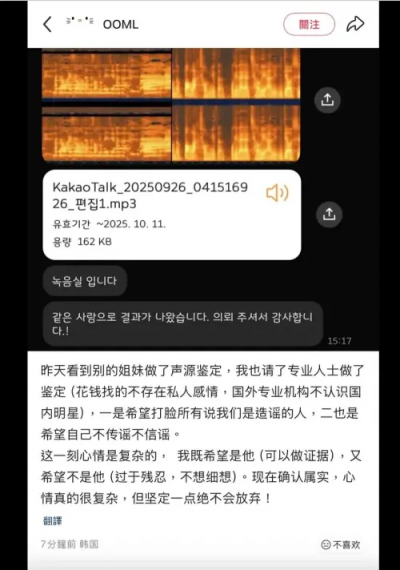 隨著事件延燒,錄音檔也成為討論焦點。有粉絲將現場的音檔,送至韓國獨立鑑定團隊進行分析,表示:「僅為求真,不造謠、不傳謠」。結果比對結果顯示,現場錄音中的恐嚇聲音,與範世錡過去公開的影片聲紋高度吻合,高達 99.57%。這項數據幾乎說明,兩者就是同一人,網友紛紛直呼:「太可怕了」。