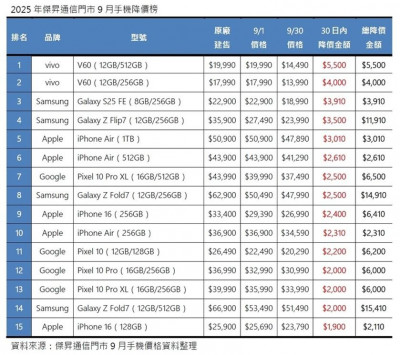 其中,9月才剛上市的S25 FE(8GB/256GB)空降榜單,等於一開賣,價格就下修近4千元。新代摺疊機方面,總降價金額也已累績1.2萬~1.5萬元之間。以Z Flip7(12GB/256GB)來說,目前通路最低價格已落在2.4萬元內。