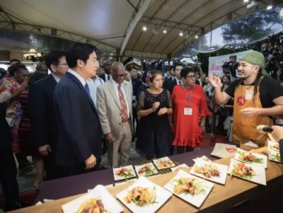 外交部晚間於臺北賓館舉辦國慶酒會,宴請各國外賓及駐台機構官員伉儷,總統賴清德、副總統蕭美琴帶領外賓,品嚐道地台灣美食小喫,盛讚每一道料理都好喫,還說「這是台灣最強的地方」,還跟外賓大力推銷「剝皮辣椒雞湯」,也是賴清德唯一有品嚐的一道料理。