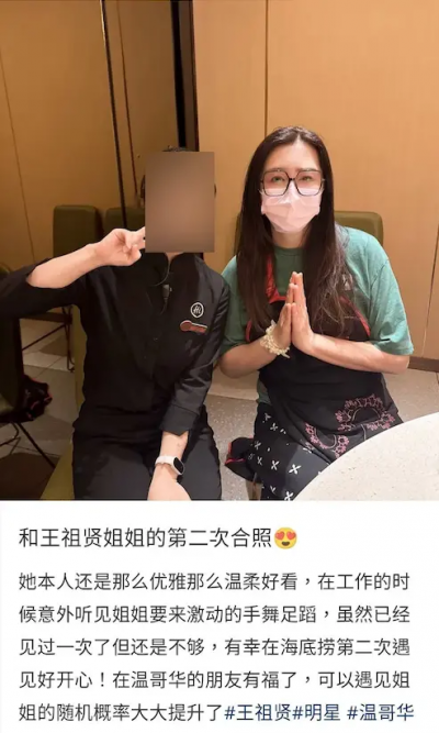 昨(9)日,一名中國網友在小紅書分享與王祖賢的合照,興奮表示:「女神來海底撈了」,照片中可以看到,王祖賢雖戴著口罩,但凍齡美貌藏不住,王祖賢態度相當親切,詢問合照時也笑著答應,網友忍不住直呼:「在溫哥華的朋友有福氣了,遇見姐姐的隨機概率大大提升」。