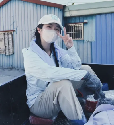 賴可國慶衝花蓮挖泥 全身包超緊認不出賴可曝光了自己的救災穿搭,她頭戴白色鴨舌帽、白色口罩、淺色防曬外套、方便行動的工裝長褲、手戴手套拿著鏟子,全身身上只露出了雙眼,穿著十分低調,如果不是她的同行親友,一定認不出這就是賴可本人。