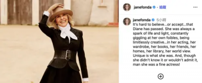 珍芳達曾在電影《高年級姐妹會》與黛安基頓合作,她沉痛表示:「我心碎了,我認識黛安多年,能與她一起主演電影是我的榮幸,她是如此才華橫溢、美麗、令人發笑。在我的心中,她是一位真正的藝術家。」