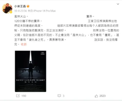 其實王晶在拍吐槽影片前,8日就已經在微博發文罵過《風林火山》,他認為這部電影120分鐘都是在賣弄,「王家衛壓榨演員榨出他們從未到達的高度。這部片壓榨演員卻看得出每個人都因為有合約限制,只有勉強把戲演完,反正沒法演好。」不過王晶也承認自己沒把電影看完,因此也有網友認為他的評價並不客觀。