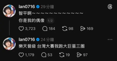 比賽進行期間,樂天桃猿推進隊長、前樂天女孩籃籃也同步關注戰況,當球隊好不容易追平比數時,她立刻在Threads發文:「樂天晉級,台灣大賽我跑大巨蛋三圈!」幽默宣言瞬間引爆討論,粉絲湧入留言區刷起:「等你跑」、「要錄影存證」、「籃籃說到做到」,場外氣氛比球場還熱。