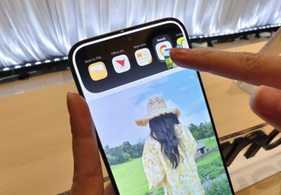 螢幕上方的「原子島」,當使用相關功能時會自動跳出,例如直接拖拉照片至其他App。(圖/記者吳佩樺攝)