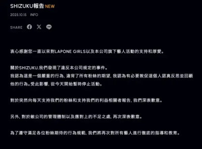 事務所在聲明中直指「關於SHIZUKU飯田栞月,我們發現了違反本公司規定的事件。」公司認為這是「一個嚴重的行為,違背了所有粉絲的期望」,因此有必要暫時停止飯田栞月的活動,以敦促其深刻反省。