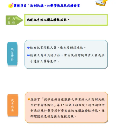 對於改善方式,金管會業者應落實「提供虛擬資產服務之事業或人員防制洗錢 及打擊資恐辦法」第15條第1項規定,建立測試防制洗錢及打擊資恐制度有效性之獨立稽核功能,並辦理獨立查核及提具查核意見。