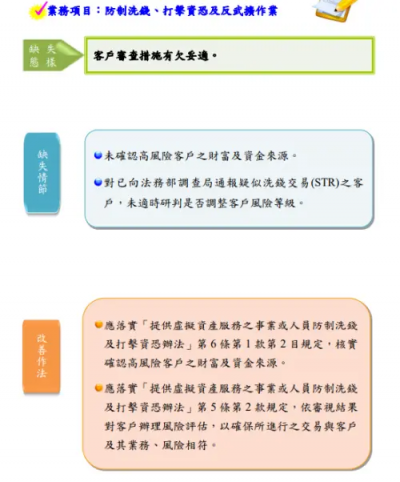 對於虛擬資產服務業務與人員,金管會2025年上半年金檢報告顯示,VASP業者在防制洗錢、打擊資恐及反武擴作業上有3大缺失。第1大缺失即客戶審查措施有欠妥適,包括未確認高風險客戶之財富及資金來源;對已向法務部調查局通報疑似洗錢交易(STR)的客戶,未適時研判是否調整客戶風險等級。