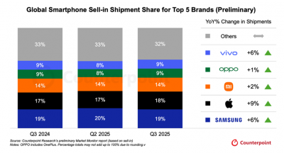 根據Counterpoint數據,全球前五大品牌依序為三星(19%)、蘋果(18%)、小米(14%)、OPPO(9%)和vivo(8%)。受惠iPhone 17系列熱賣,蘋果出貨量年增9%,是前五大品牌中成長幅度最高的。