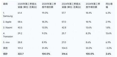 值得注意的是,三星之所以仍穩住全球第一的地位,主要依賴中階A系列熱賣,第三季上市的Z Fold7、Z Flip7也為整體銷量增添助力。不過第四季,蘋果是否有機會超車三星,將成為市場焦點。