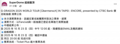 「G-DRAGON 2025 WORLD TOUR [Übermensch] IN TAIPEI : ENCORE」台北大巨蛋安可演唱會將於11月1、2日舉行,演唱會採實名抽選制,許多粉絲紛紛搶著登記抽票。不過因為GD的魅力太過強大,即使在非常巨大的場地開演唱會,依然有不少民眾沒能順利購得門票,無緣進場看歐巴一眼。