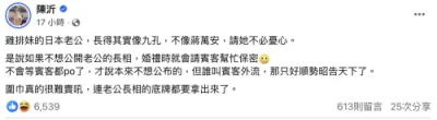其實不像蔣萬安?陳沂認為更像九孔 陳沂在個人粉專上發文表示,「雞排妹的日本老公,長得其實像九孔,不像蔣萬安,請她不必憂心。」陳沂隨後更對鄭家純「意外曝光」的說法提出質疑,暗示這是預謀的炒,「是說如果不想公開老公的長相,婚禮時就會請賓客幫忙保密,不會等賓客都po了,才說本來不想公布的,但誰叫賓客外流,那只好順勢昭告天下了。」