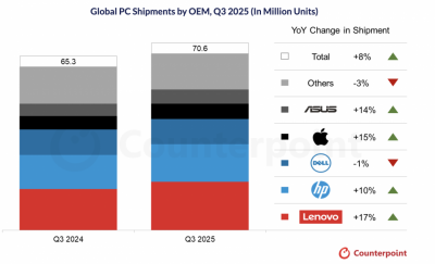 隨著微軟在 10 月正式終止 Windows 10 系統的支援,加上美國關稅戰等因素隱形,市場上湧現一股 PC 換機潮!研調機構 Counterpoint Research 數據指出,全球第三季 PC 出貨量同期增長 8.1%,更有多家業者締造超過 10% 的成長率。