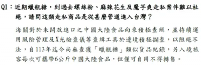 針對《NOWNEWS》記者去年提問螺獅粉、麻辣花生及魔芋爽,仍至蠟瓶糖等走私食品如何進入台灣,關務署當時回覆,「海關對於未開放進口之中國大陸食品向來積極查緝,並持續運用風險管理及X光檢查儀等查緝工具於邊境積極攔查,以阻絕不法,自113年迄今尚無查獲「蠟瓶糖」類似貨品紀錄,另入境旅客每次可攜帶6公斤中國大陸食品,但僅可自用不得轉售。」