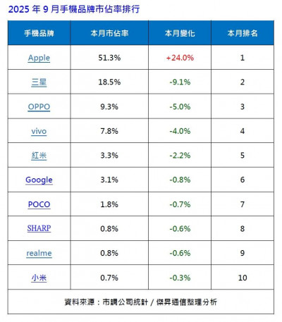 台灣2025年9月手機品牌市佔率排行。(圖/傑昇)