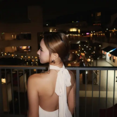 這件洋裝的設計極為巧妙,正面為高領剪裁,襯托出頸部線條的修長;而最大的亮點在於背面,僅以緞帶繫於頸後,Elly大方秀出大面積的光滑美背,在夜色中,周遭暖黃色的燈串與建築光影,成為了最自然的背景,將她的身形輪廓襯托得更為優美,讓她彷彿是從電影場景中走出的主角。