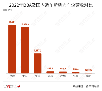 同一年,蔚來、理想、小鵬、零跑的銷量均爲10萬輛出頭,營收分別爲492.6億、452.9億、268.6億和123.85億元,不到BBA的1/10。