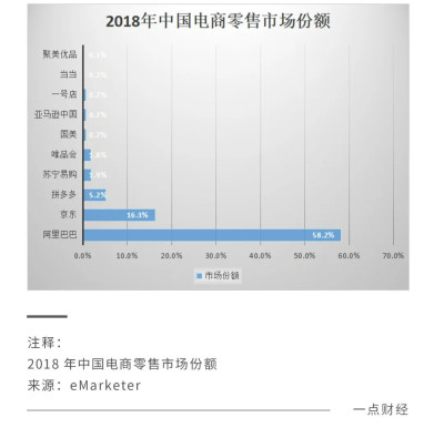 此後的15年間,馬雲與劉強東,憑借着各自的領導哲學,帶領阿裏和京東披荊斬棘,成長爲中國電商領域的兩棵參天大樹。eMarketer數據顯示,2018年中國電商零售市場份額中,阿裏以58.2%佔據首位,京東佔17.3%,兩家合計佔據四分之三份額,存在絕對競爭優勢。