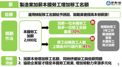 他補充,增額移工3年工作期滿續聘,仍需幫本國勞工再次加薪;而如果被加薪的本國勞工離開公司,那麼也必須要再幫一個勞工加薪,否則將會沒收名額。