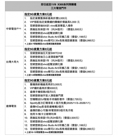 此外,凡於指定通路預購X300系列並完成官網登錄,可參加抽獎,獎項包括巨星演唱會門票(每1組2張) 、世界五大洲奢旅雙人遊,以及X300 Pro全能攝影師套裝2盒,共抽出5組幸運得主。