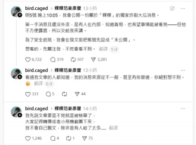 玉米泉哥表示,自己不會主動刪文,若文章不見一定是被檢舉,他也堅持不透露消息來源,只回應《NOWNEWS今日新聞》記者,消息的可靠度高達99%。另外,玉米泉哥還預告,今晚將公開一份關於粿粿的「獨家炸裂大瓜消息」,他指出:「第一手消息且還沒外流,是有人在內部、知道真相,也希望事情能被看見——但他不方便露面,所以交給我來講。」