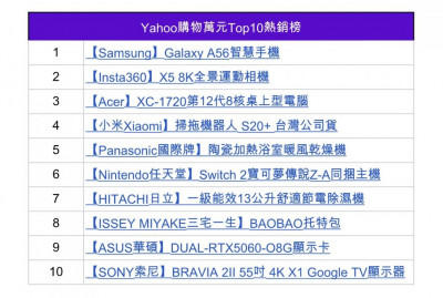 Yahoo購物也搶先公布「萬元TOP 10熱銷榜」,榜上幾乎清一色為3C與家電產品,冠軍由三星A56中階手機奪下。這款手機自上市以來,一直是全台最暢銷的Android機型。