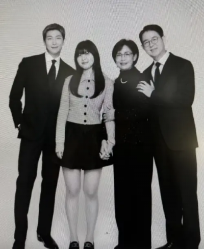 RM昨日突然在社群曬出自己的全家福,照片中一家四口穿著同品牌、同款式的運動外套靠在一起,還比出了同樣拍照姿勢;另一張照片則是全家穿著正裝,RM和爸爸穿著西裝、妹妹穿著針織衫和短裙、媽媽則是穿著連身長裙洋裝,家庭成員看起來有一種學識淵博的感覺。