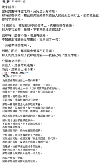 野獸今日也加碼發文,表示會講出這段經歷,是因為最近《棒棒堂》3個字被貼上標籤、拿來取笑,「這樣的形象,反過來也影響了我的生活。我理解,誰都不想它變成今天這樣;但對我來說,那不是節目效果,那是我撕心裂肺投入過的一段人生。」他說自己曾在這個舞台認真努力過,回憶過往只是想告訴大家他當初為了出道有多拚命。