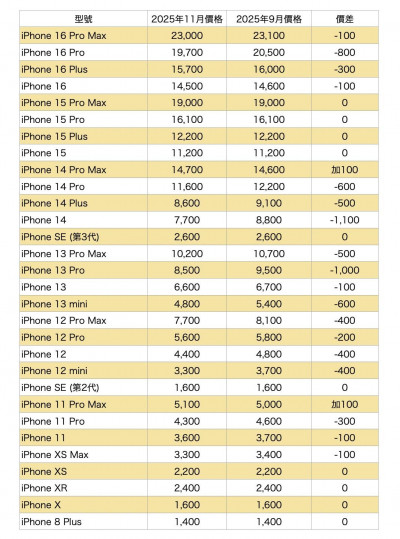 根據最新公布的11月價目表,雖然依舊提供30款舊機折抵,但與9月行情相比,有多達18款機型的折抵金額縮水,跌幅介於100~1,100元之間,其中以iPhone 14掉最慘,一口氣少了1,100元。整體雖屬微幅調整,但對正打算換機的果粉來說,仍難免感受「有些心痛」。