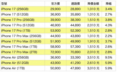 蘋果iPhone 17系列在台開賣約1個半月,全系列12款機型終於出現明顯的價格鬆動,儘管整體幅度不算大,但對果粉而言,「能省一點總是一點」。從售價走勢分析,目前下調幅度最高的是iPhone Air,降幅高達9.5%。