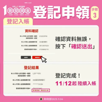 2. 11月11日起至11月17日止完成登記並經檢核成功者,款項將自11月12日18時起至11月18日,依各銀行作業程序陸續入帳。
