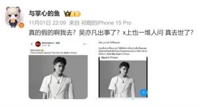 本月1日開始,吳亦凡的死訊在中國微博上瘋傳,多數網友認為官方沒出面通報,這應該是假消息,呼籲大家不要見到謠言就隨之起舞。另外也有網友提到,今年4月時,才有一名自稱是律師的微博用戶發文,說吳亦凡從監獄移到看守所了,「是發現漏罪喔,又要審理,這次據說偷稅漏稅涉案三個多y(指3億多人民幣)」。